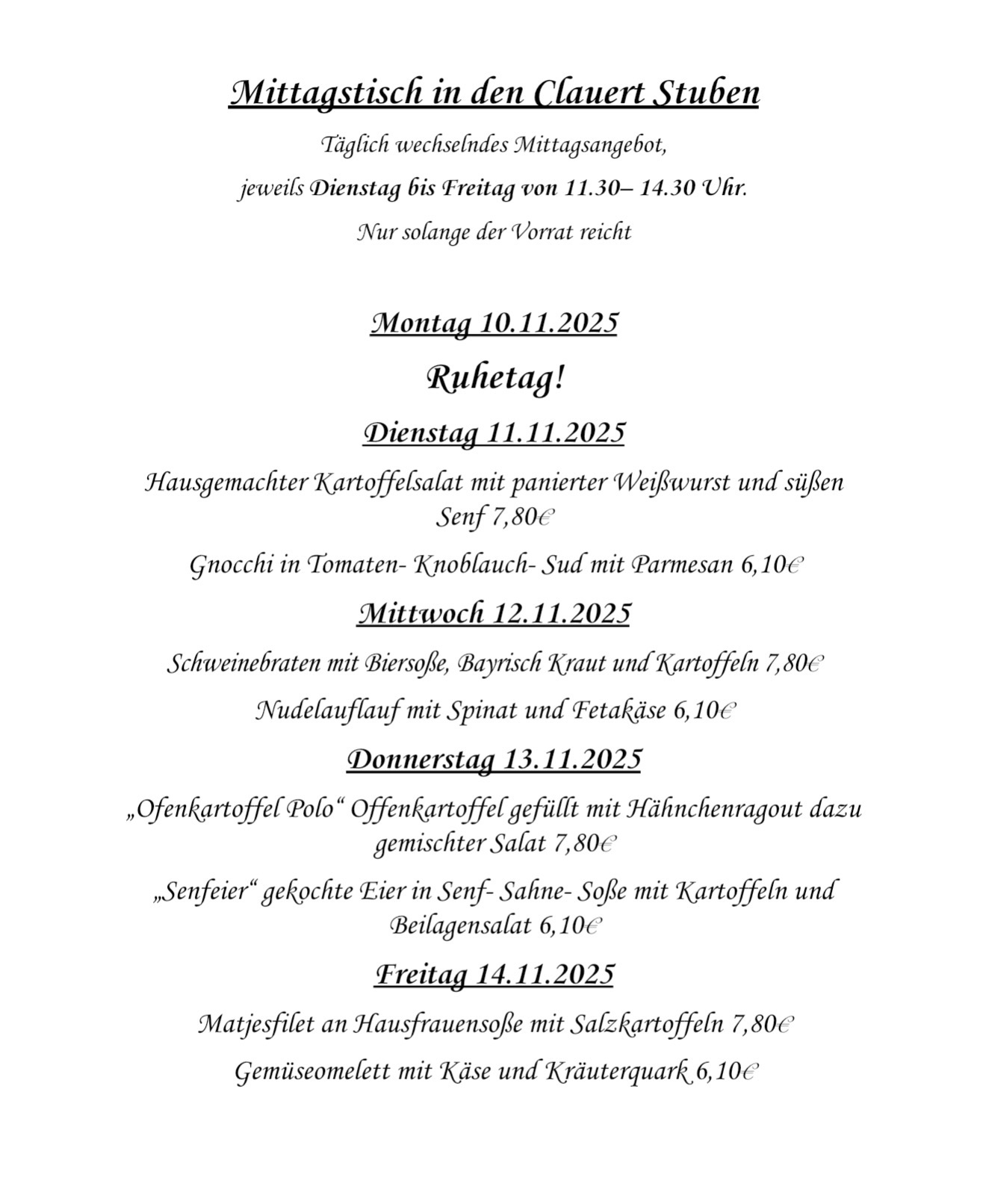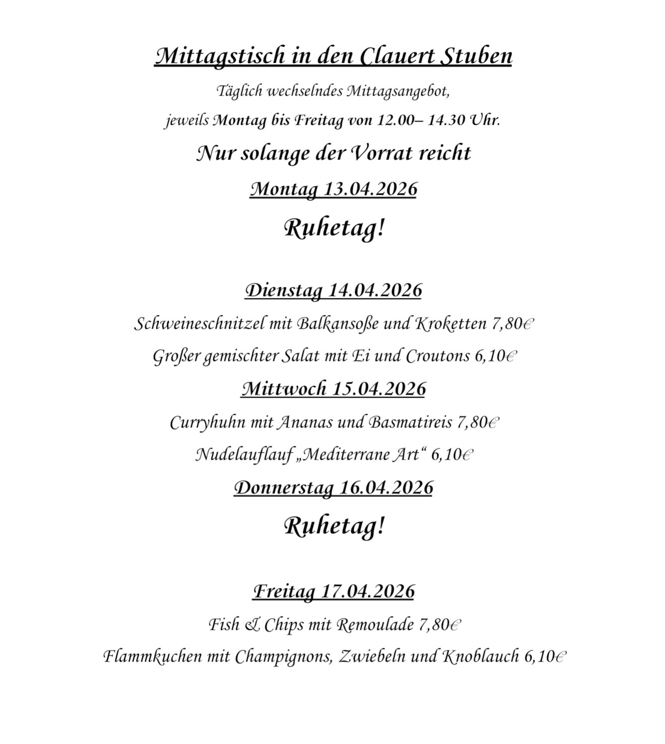 Von Dienstag bis Freitag kochen wir täglich einen frischen und abwechslungsreichen Mittagstisch mit täglich wechselnden Gerichten.